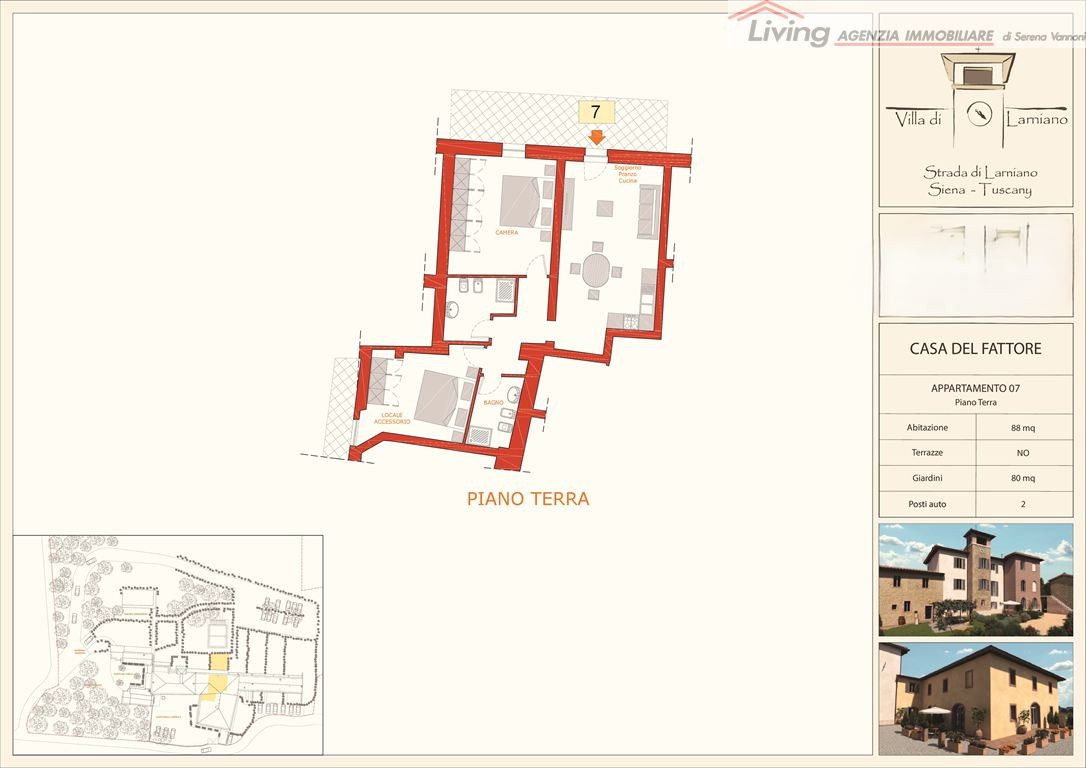 A 5 km da Siena nella Zona di Pieve a Bozzone, in posizione collinare, ristrutturazione di appartamenti in villa e nel rispettivo borgo. Varie metrature con giardino privato, e parco condominiale, piscina. Gli appartamenti saranno realizzati in Classe energetica A3 con riscaldamento a pavimento e raffrescamento con pompa di calore, e un impianto di deumidificazione e ventilazione meccanica controllata. Le rifiniture saranno di altissima qualità con possibilità da parte dell'acquirente di poter scegliere da un capitolato molto ampio. Vi presentiamo nello specifico un appartamento di mq. 95 con ingresso indipendente da giardino privato con zona giorno con angolo cottura, bagno/lavanderia, ripostiglio, due camere. Due posti auto. Classe energetica A3. Rich. € 295.000,00 RIF. V 861-7